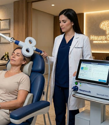 Protocolo de neuromodulación con aprobación FDA para el tratamiento de la depresión resistente. Esta intervención de primera línea utiliza pulsos magnéticos para estimular la corteza prefrontal dorsolateral, logrando tasas significativas de remisión clínica en pacientes que no han respondido satisfactoriamente a la farmacoterapia convencional.