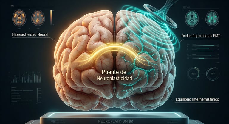 La Estimulación Magnética Transcraneal revoluciona la rehabilitación neurológica al corregir este desequilibrio interhemisférico. Utilizando protocolos de baja frecuencia, la EMT modula (frena) la hiperactividad del hemisferio sano, liberando al hemisferio dañado de esa inhibición constante. Alternativamente, protocolos de alta frecuencia pueden usarse para estimular directamente el tejido circundante a la lesión. Esta "preparación" del cerebro aumenta exponencialmente la neuroplasticidad, maximizando los resultados de la fisioterapia y acelerando la recuperación de la movilidad, la fuerza y la independencia del paciente.